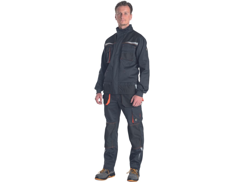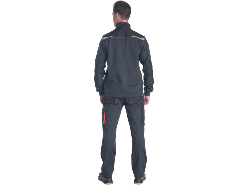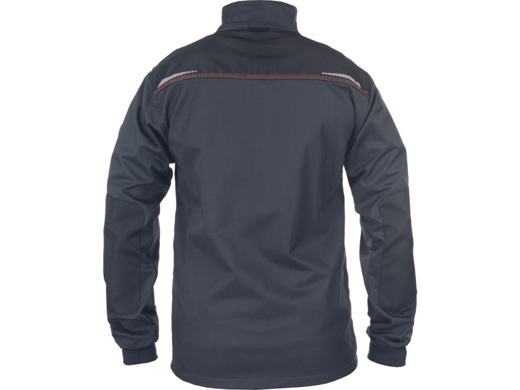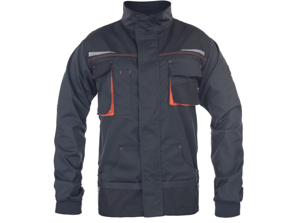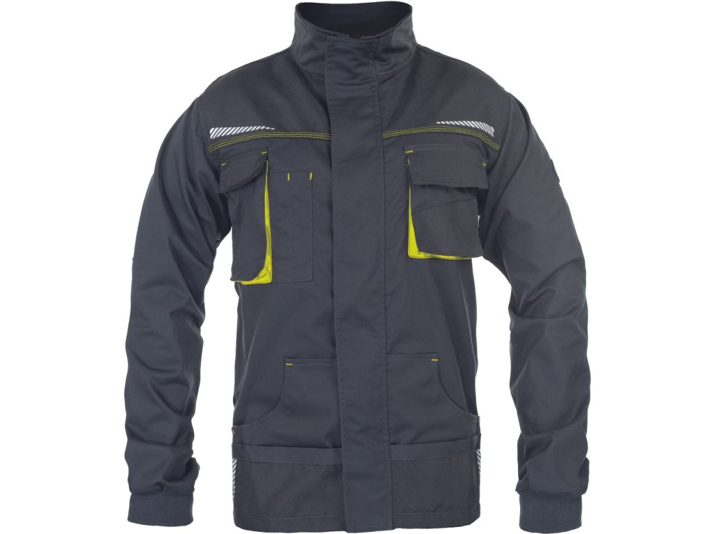 Popis: pánska vysoko odolná strečová pracovná bunda • predné zapínanie na zips s príklopkou • 2 bočné vrecká • 2 náprsné vrecká, jedno na mobilný telefón • vystuženie Oxford 600D na ramenách a lakťoch • potlač reflexných segmentov • pletené elastické manžety rukávov