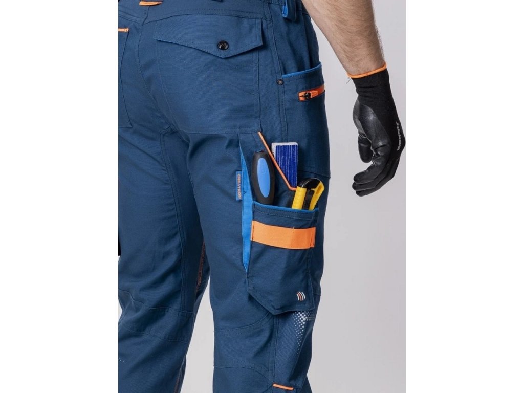 - na pravej nohavici je umiestnené multifunkčné vrecko na skladací meter, skrutkovač a odlamovací nôž so širokými pútkami