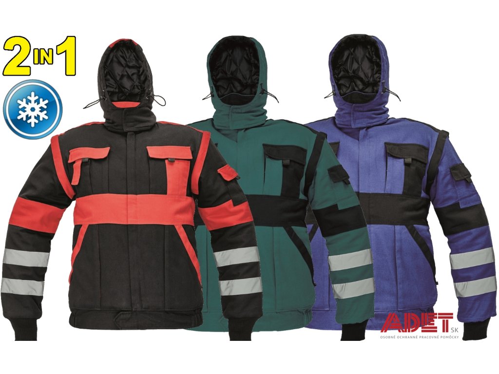 zimná montérková bunda s kapucňou a odopínateľnými rukávmi doplnená o široké reflexné pruhy pre vyššiu viditeľnosť zo série MAX RFLX ČERVA