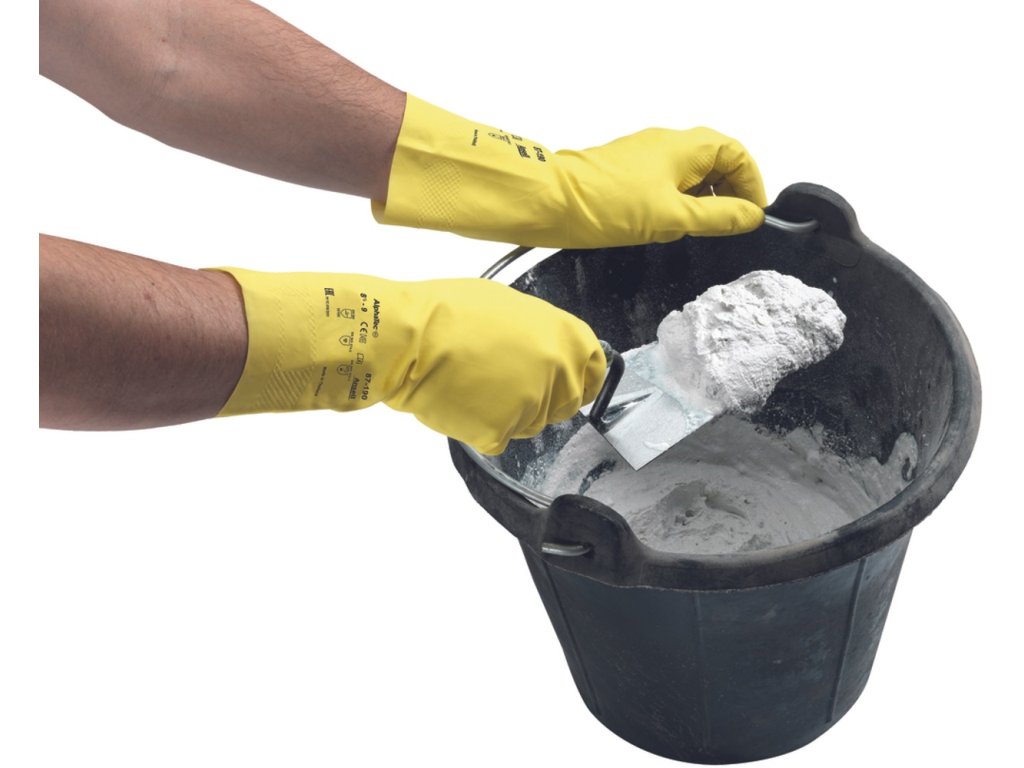 žlté chemické rukavice z 0,35 mm silného prírodného latexu s velúrovou úpravou vo vnútri